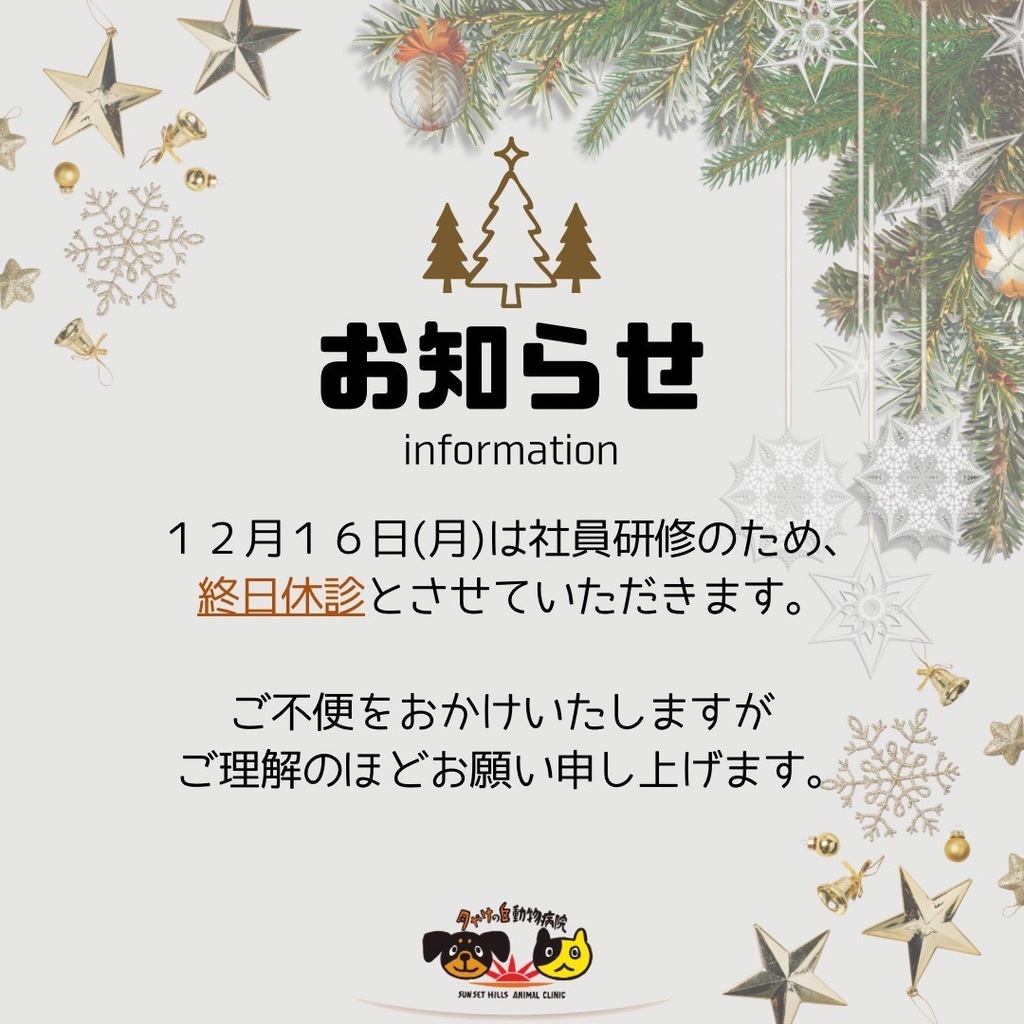 12月16日(月)は社員研修のため、「夕やけの丘動物病院」「あざみ野どうぶつ医療センター」ともに【終日休診】とさせていただきます。