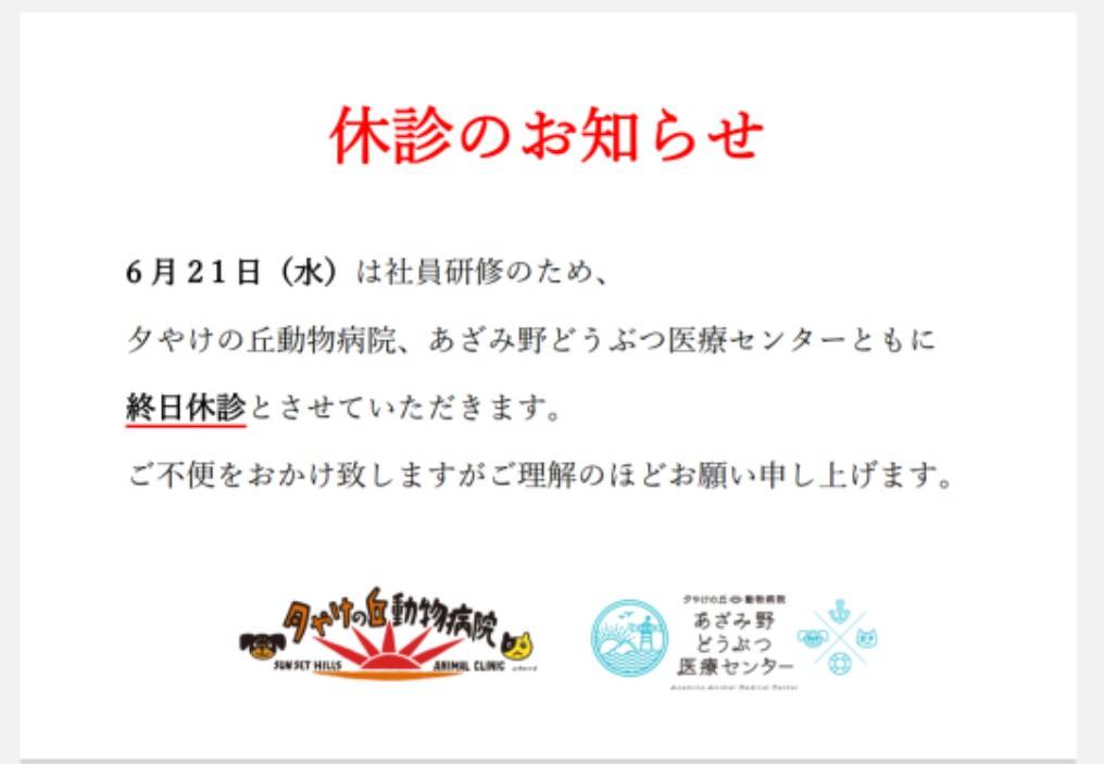 6/21(水)は社員研修のため、「夕やけの丘動物病院」「あざみ野どうぶつ医療センター」ともに【終日休診】とさせていただきます。