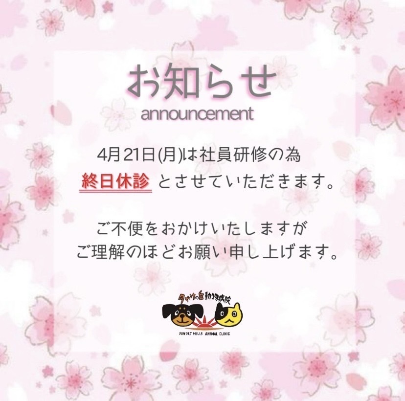 4/21(月)は社員研修のため【終日休診】とさせていただきます。