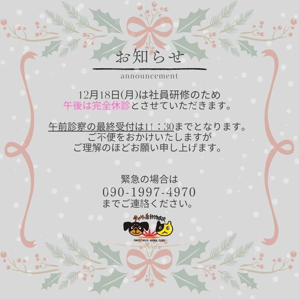 12月18日(月)は社員研修のため、午後は完全休診とさせていただきます。