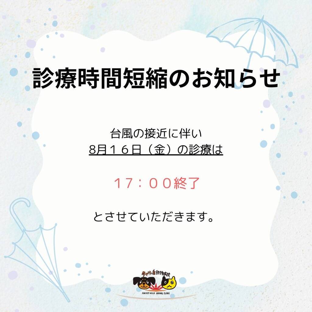 台風の接近に伴い、8月16日(金)の診療は17:00終了とさせていただきます。