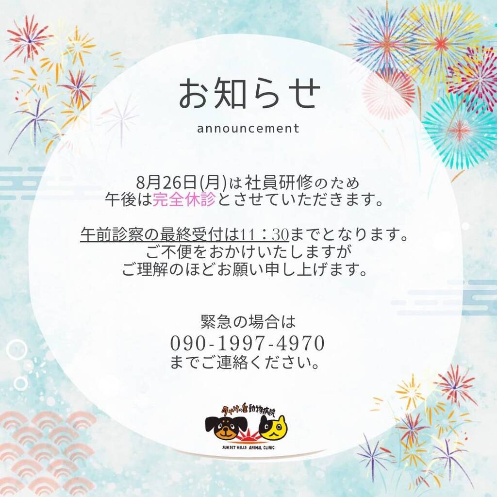 8月26日(月)は社員研修のため、午後は完全休診とさせていただきます。