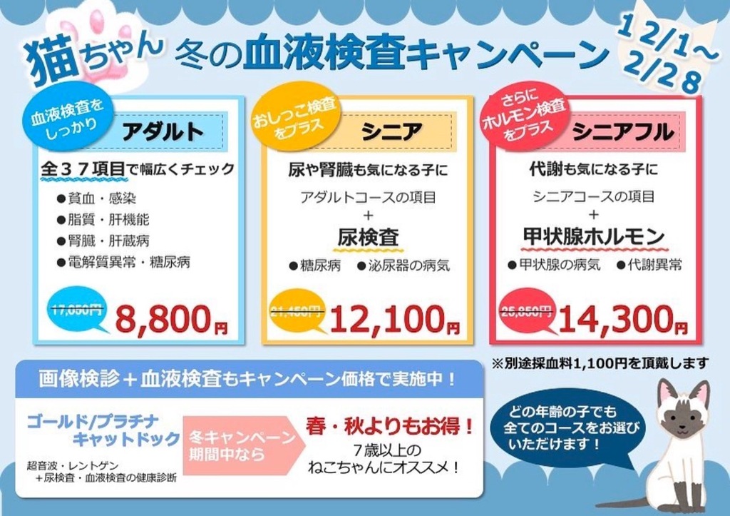 12/1〜2/28まで、ねこちゃんの血液検査キャンペーン実施中🐈❄️
