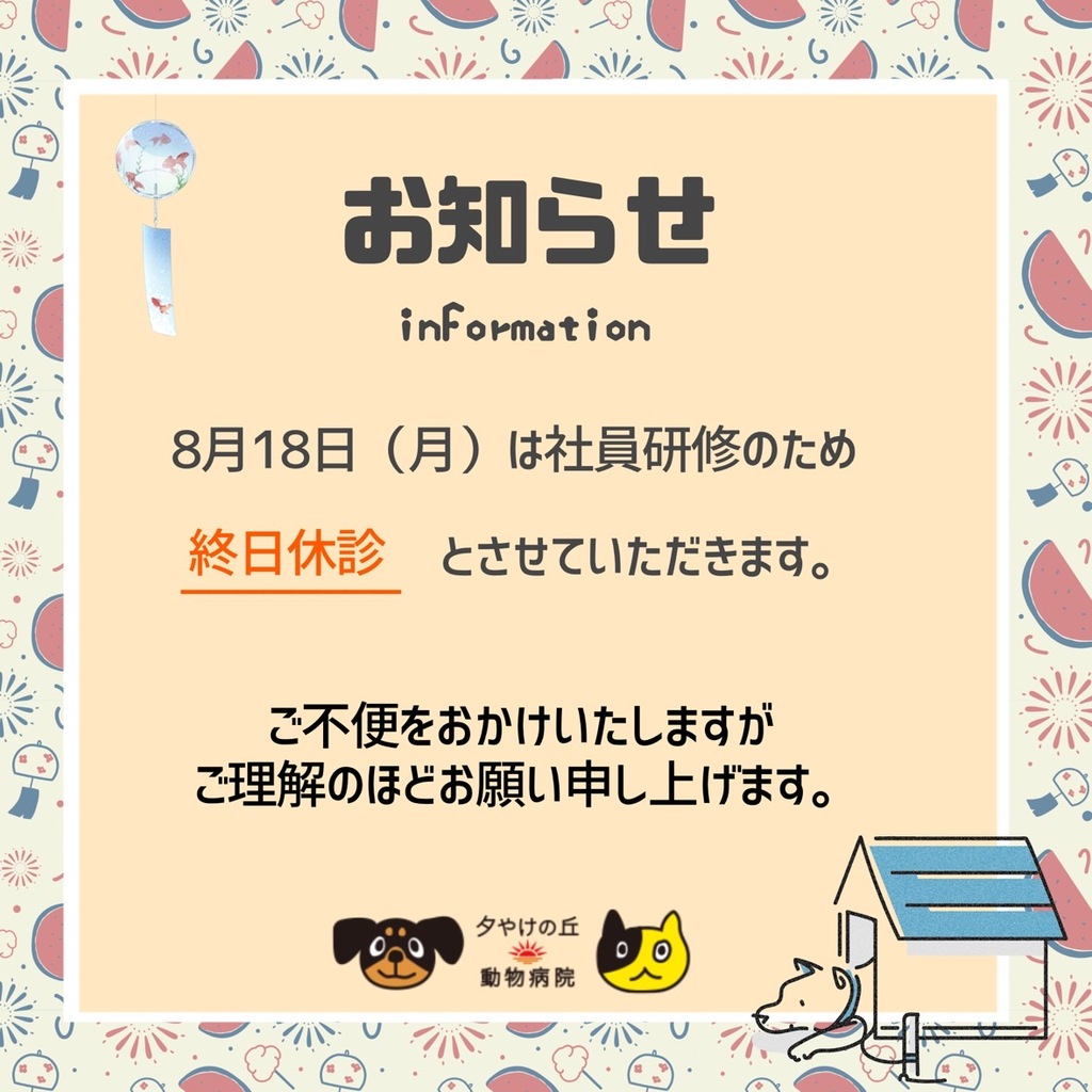8月18日(月)は社員研修のため終日休診とさせていただきます。