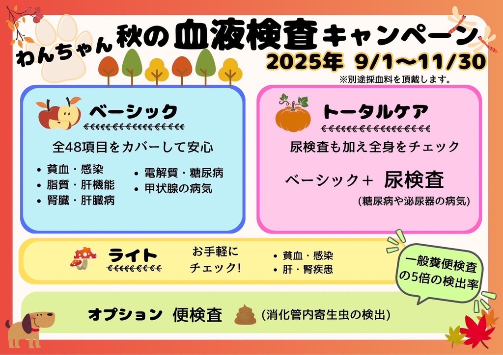 秋の血液検査キャンペーンでは春同様3つのコースをご用意しています🐾