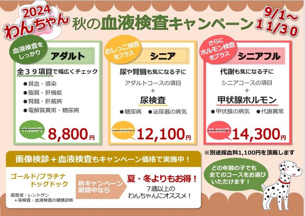 9月から、わんちゃん秋の血液検査キャンペーンを実施中です🍁🍂🐶 (11月30日まで)